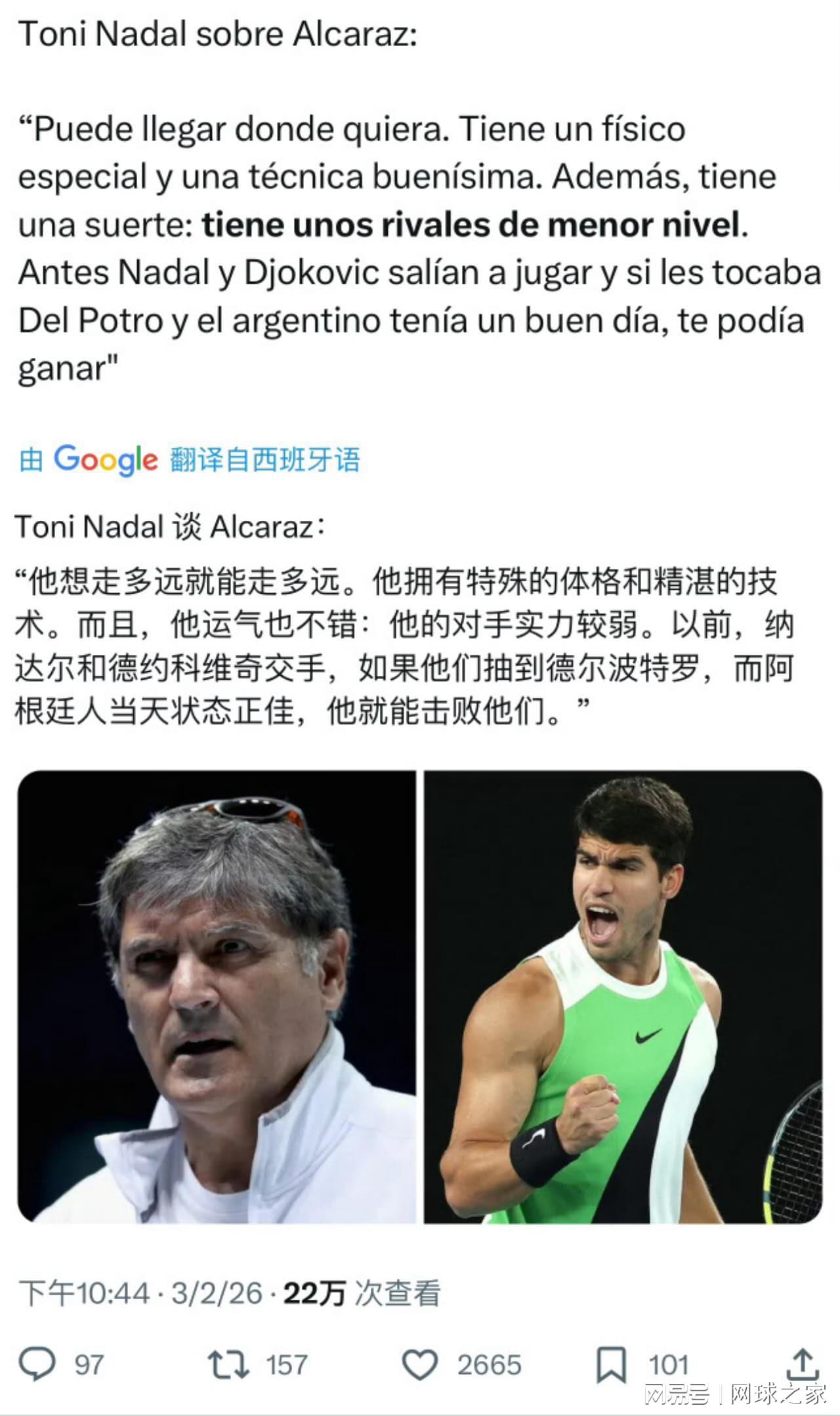 这位培养出一代天王的功勋教练,在肯定阿尔卡拉斯拥有“出色的身体条件”和“卓越的技术”后,话锋一转,对这位新科澳网冠军的夺冠之路给出了令人意外的评价:在他看来,阿尔卡拉斯之所以能夺冠很大一部分归功于他的运气不错,托尼叔叔表示,“他的对手整体水平都不如他,并且决赛很幸运遇见比他水平低很多的选手。”